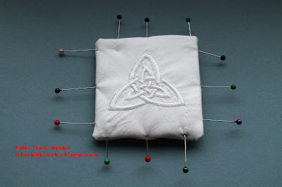 I traced a Celtic Knot pattern on my Batiste fabric and basted the traced fabric to a square of white cotton then placed them in the hoop.